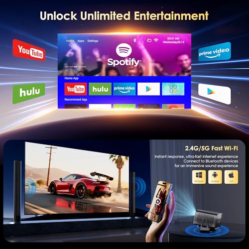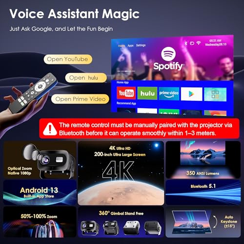 [Smart Projector Powered by Android 13] Step into the future of home entertainment with our next-generation smart projector featuring Android 13. Instantly access and download over 10,000 apps—including Netflix, Prime Video, YouTube, and more—right from the built-in interface. With a massive content library of 500,000+ movies and shows, your favorite entertainment is always at your fingertips.?NOTE:BEFORE USING THE PROJECTOR, CONNECT THE REMOTE’S BLUETOOTH.?