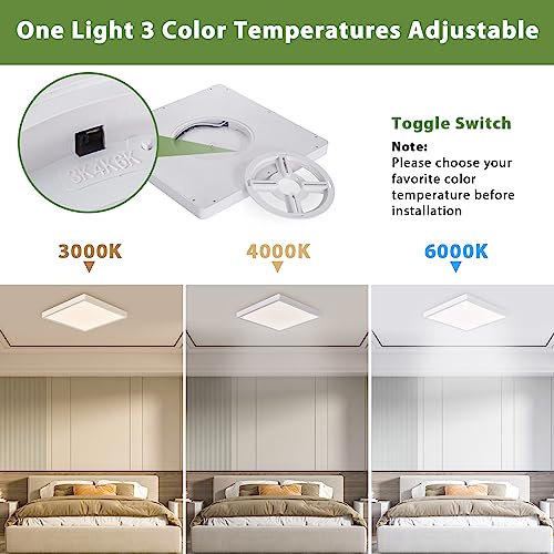 ?Adjustable Color Temperatures?There are 3 color temperatures available for this LED flush mount ceiling light: 3000K (Warm White), 4000K (Neutral White) and 6000K (Daylight White). Simply slide the button to select your desired color temperature before installation. The low profile ceiling light with integrated sealed structure, no shadow or black spot inside the lamp after long-term use. Rated to IP40.