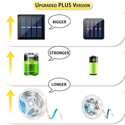 ?Upgraded Version, Longer, Larger, and Stronger?This solar powered light strip has been upgraded with a larger solar panel size of 3.5 inches, an increased battery capacity of 1800 milliampere-hours, extended size to 19.7 feet, and an upgraded number of LED lights to 180, making it look small but with sufficient energy.