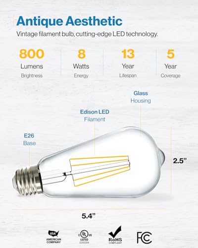 ? Top Rated ST64 (ST19) LED Bulb E26 Base ? DIMMABLE - Seamless dimming capabilities (10%-100%) to suit any mood or decor. Our ST64 LED lights combine charming vintage design with the latest in LED technology. ? WATERPROOF - Our LED ST64 bulbs are weatherproof and can stand up to the elements. Dust-tight construction provides you with reliable bright light in any weather. ? UL CERTIFIED - We uphold the highest standards for all our products by testing each product for optimal performance and safety. ? SUNCO BENEFITS - 5 Year Protection! Sunco is proudly based in the USA, offering quality products at affordable prices backed by industry-leading warranties and knowledgeable support specialists.