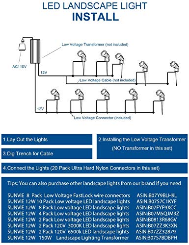 ?Easy Installation?Just insert the light spike stand into the suitable position on ground, then use our fastlock connectors connect landscape lighting fixtures. Extra accessories needed: transformer, low voltage wires( NOT INCLUDED in this pack)