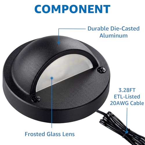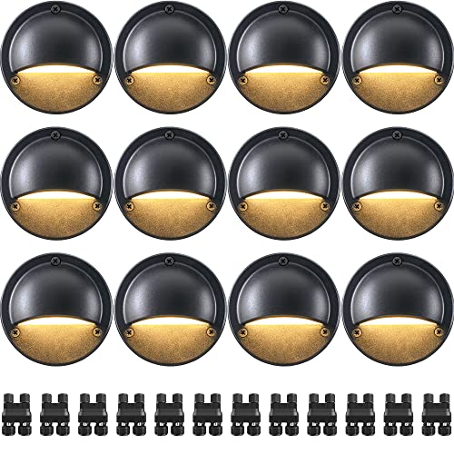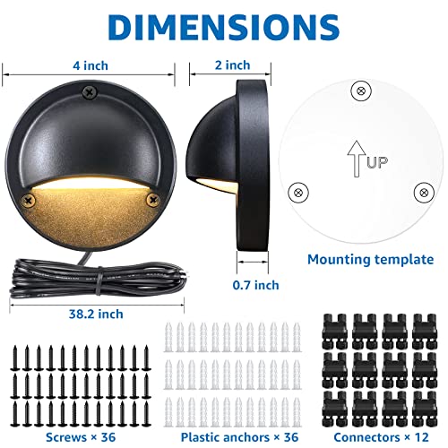 UPGRADED LED DECK LIGHTS - 12 pack 500LM 3000K warm white LED deck lights with anti-glare design, make your outdoors more beautiful and warmer. Build-in led chips and die-cast aluminum body can make it more durable, up to a lifespan of over 50000 hours. UPGRADED WATERPROOF DESIGN - SUNVIE 5W low voltage deck lights, IP65 waterproof design, pressure rubber gasket and rubber pad sealed wire exit. Perfect for stairs, fence, handrail, deck, post, patio, walkway, garden and so on. UPGRADED FASTLOCK2 CONNECTORS - Come with upgraded fastlock2 connectors, only one connector is required per connection. Quicker and more convenient. Perfectly match 12/14/16/18 AWG low voltage landscape lighting wire. EASY TO INSTALL - Just need to drill holes with template, fasten the light with screws, easy installation. Powered by 12-24V AC/DC, compatible with most outdoor low voltage landscape lighting system. LIFETIME WARRANTY - 30-day money-back guarantee, 24-month replacement warranty and lifetime after-sales support guarantee to protect your rights and benefits. Buy with confidence.