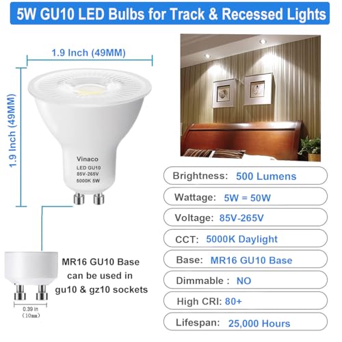 2,?Energy Efficient & Money Saving?: Our 5w gu10 led light bulb is equivalent to gu10 halogen 50w bulbs. With the same luminous effect, our gu10 led bulb 5000k can save 90% of energy than ordinary bulbs, effectively saving your electricity costs. In addition, the US standard 120V power input makes them compatible with most power supplies sold in market such as recessed tracking lighting, hanging lights, table lamps at home or office.