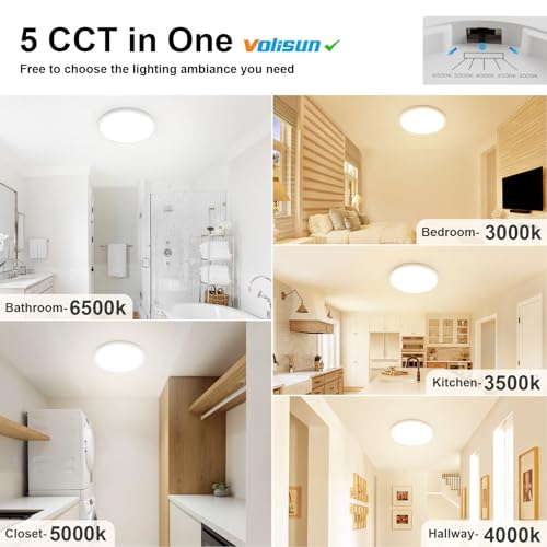?5 CCT Selectable ?The VOLISUN ceiling light fixture offers 5 selectable color temperatures in one: warm yellow(3000K), soft white(3500K), neutral white(4000K), daylight(5000K), and ultra-bright white(6500K) . You can adjust the led flush mount ceiling light to your preferred lighting effect by using the manual switch inside the fixture.