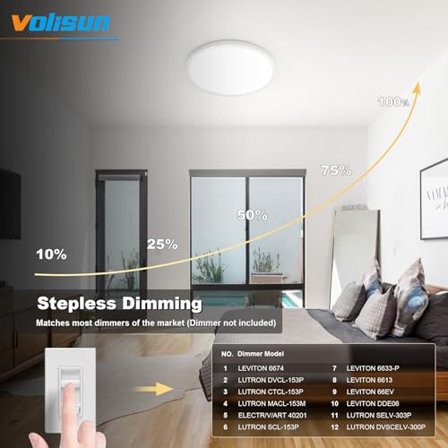 ?Eye Protection & Adjustable Brightness?Enjoy natural and even lighting that's easy on your eyes—no flicker, blue light, radiation, or UV. This dimmable ceiling light can be adjusted from 100% to 10% brightness with compatible dimmers (not included). The flush ceiling light works with most dimmers on the market, making it super convenient for you to set the perfect brightness for any mood or need. (Recommended dimmer models are listed in our detailed image.)