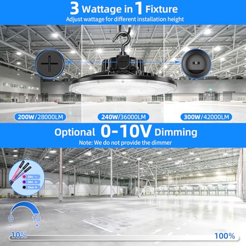 3 Wattage Switchable: YELLORE led high bay light offers 3 wattage options in 1 fixture - 300W, 240W or 200W. You can slide to suitable wattage during the installation for different brightness & installation heights. The high bay light has high efficacy of 150LM/W at 5000K, 300W puts out 42,000 Lumens, saving over 80% on electricity bill